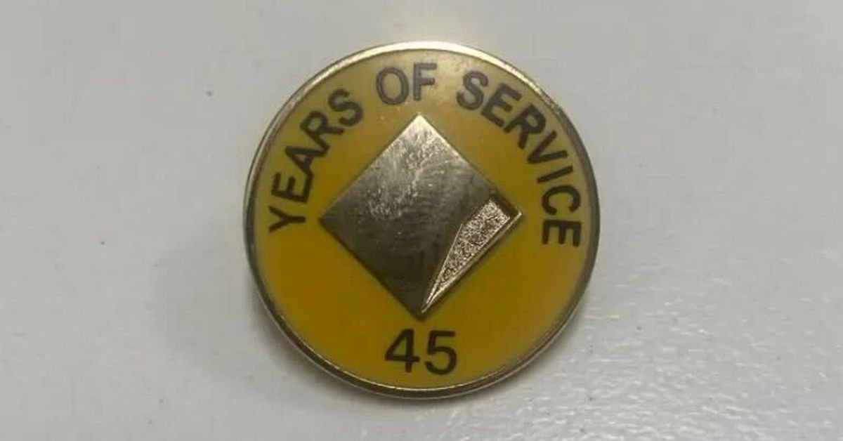 A man claims his mother received this pin and flowers for 45 years of service at the Commonwealth Bank. (included)