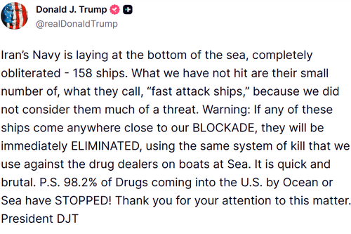 Trump posted on Truth Social shortly after the blockade went into effect, warning that if Iranian “fast attack ships” approached the blockade, they would be “immediately eliminated.” (Donald Trump/Truth Social)