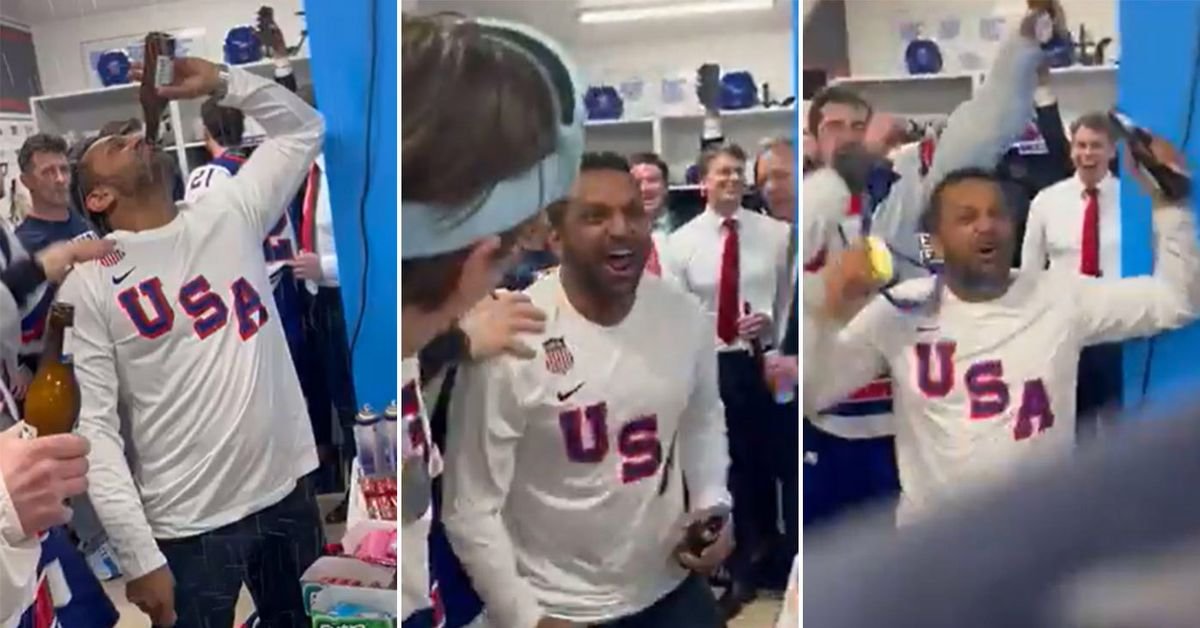 The footage also shows him spraying beer across the room as he celebrated with the team.