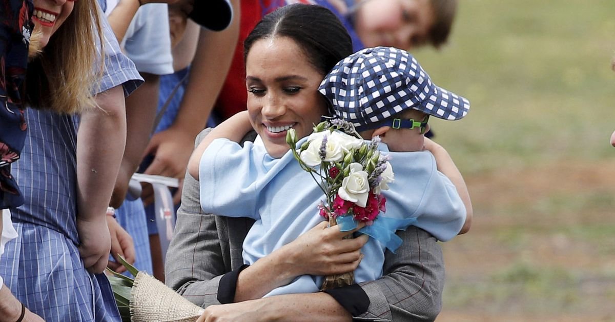 Meghan and Harry were caught in the rain in Dubbo – a much-needed downpour for the drought-stricken city. (Ian Vogler/Pool via AP)The couple’s visit was intended to shed light on the effects of the drought. (Getty)On arrival they were hugged by five-year-old Luke Vincent. (Phil Noble/Pool via AP)