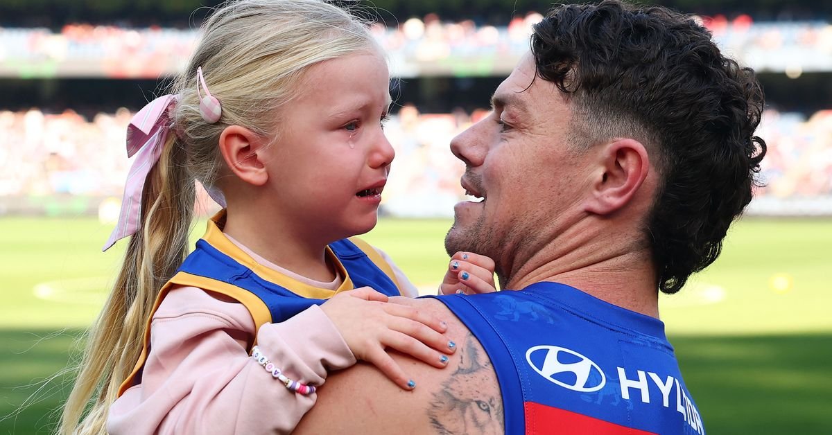 MELBOURNE, AUSTRALIA - APRIL 19: Lachie Neale of the Lions takes to the field with his daughter, Piper, during his 300th match during the sixth round AFL match between Melbourne Demons and Brisbane Lions at the Melbourne Cricket Ground, on April 19, 2026, in Melbourne, Australia. (Photo by Daniel Pockett/AFL Photos/via Getty Images)