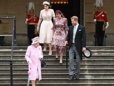 The late queen was joined by her grandchildren at a garden party at Buckingham Palace in May 2019. (Getty)