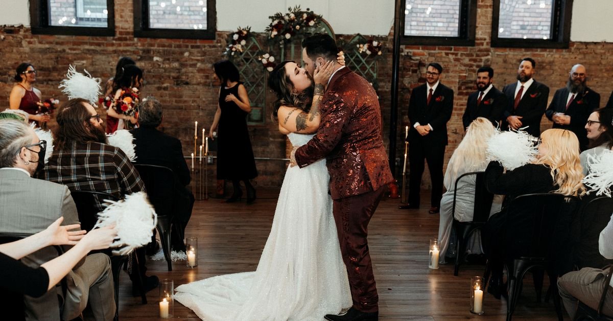 Mr and Mrs Bonadona-Bartlebaugh share their first kiss. (Supplied/Juliana Noelle Jumper)