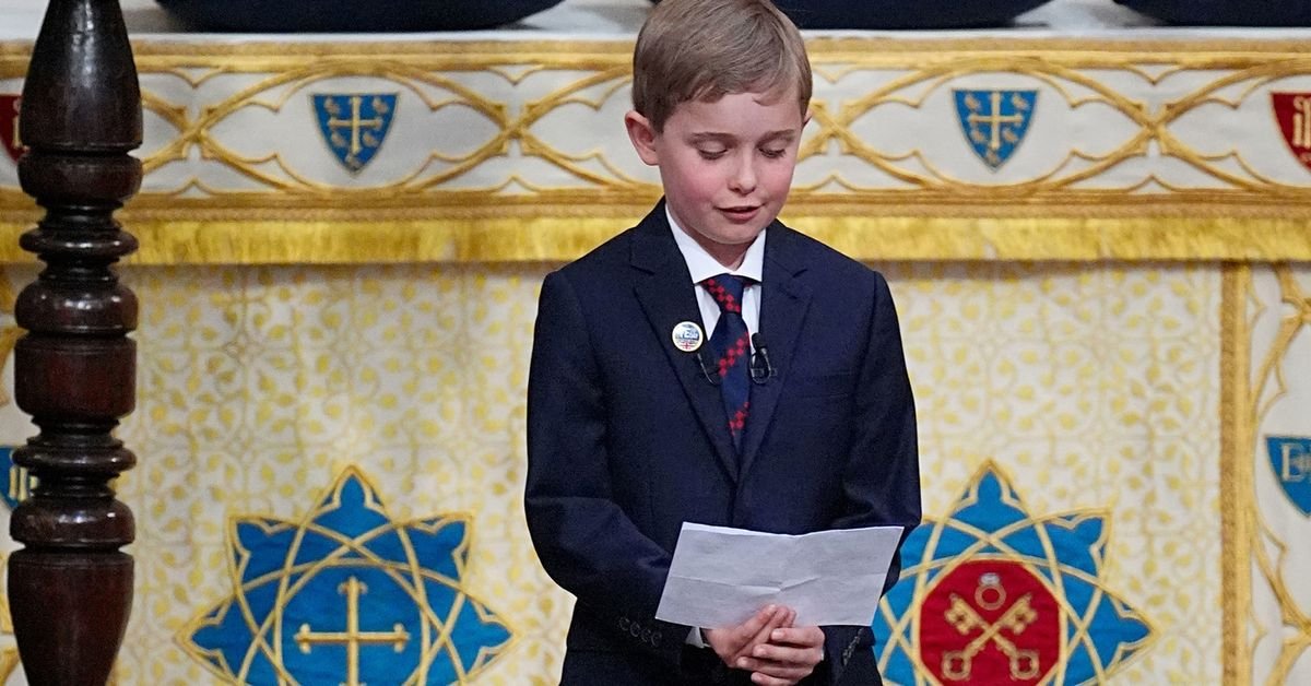 Great-great-grandson of Winston Churchill, Alexander Churchill, 10, gives a reading during a Service of Thanksgiving at Westminster Abbey on the 80th anniversary of VE Day on May 8, 2025 in London (Aaron Chown – WPA Pool/Getty Images)